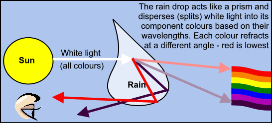 A combination of sun and rain can give an optical phenomenon of a rainbow. It is caused when the light from the sun hits the rain drops and is dispersed by refraction.